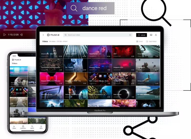 Muse.ia es una solución de vídeo marketing basada en inteligencia artificial que tiene múltiples funcionalidades, como alojar vídeo y audio y buscar vídeos por IA, así como de poder hacer uso de plantillas personalizables. Sus funciones de inteligencia artificial se basan en un indexado automático de los vídeosy búsqueda de palabras, personas, objetos, texto, sonidos, etcétera.