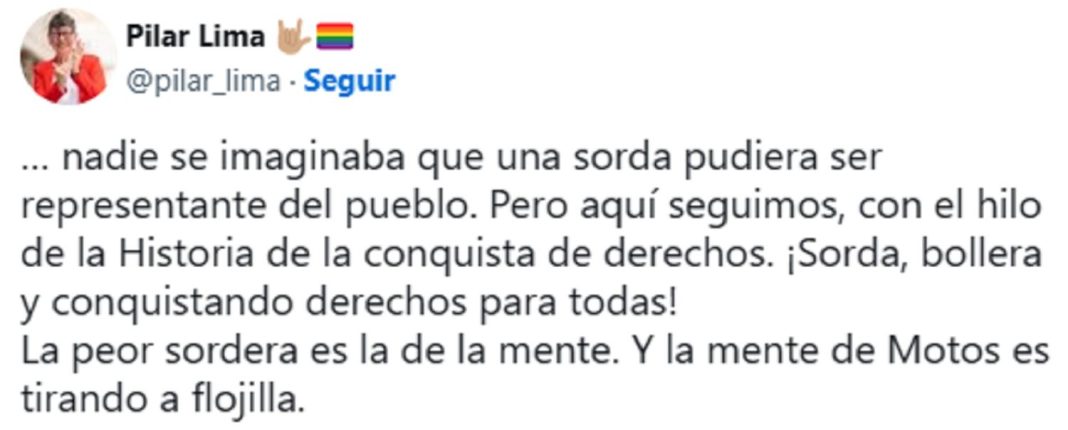 Pilar Lima utilizó la filmación donde se veía a Pablo Motos y Miguel Lago hablando de ello para divulgar lo que pensaba y llamar a la reflexión. “Hace un tiempo una persona negra no podía ni sentarse en un autobús. Hace un tiempo, era impensable que una mujer ocupara cualquier responsabilidad política. Hace un tiempo, las personas LGBTI+ no teníamos derechos. Y hace no mucho nadie se imaginaba que una persona sorda pudiera ser representante del pueblo. Pero aquí seguimos, con el hilo de la Historia de la conquista de derechos. ¡Sorda, bollera y conquistando derechos para todas! La peor sordera es la de la mente. Y la mente de Motos es tirando a flojilla”, sentenció.