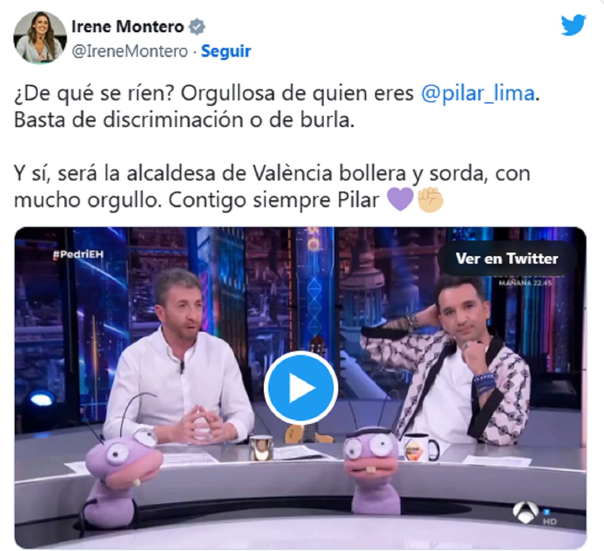 Irene Montero, habiendo conocido el suceso, también alzó la voz vía Twitter para repudiar el comportamiento del presentador y su invitado. “¿De qué se ríen? Orgullosa de quién eres Pilar Lima. Basta de discriminación o de burla. Y sí, era la alcaldesa de València bollera y sorda, con mucho orgullo. Contigo siempre Pilar”, lanzó la dirigente.