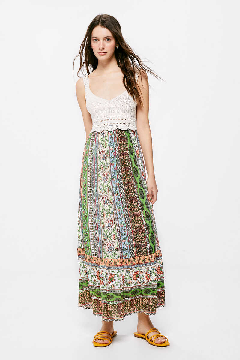 Otra de las prendas que destacan dentro de la sección de precios especiales de Springfield es este vestido de crochet. De largo midi y diseño combinado, llama la atención gracias a que su parte de arriba es de tono neutro y su falda es vaporosa y con un bonito estampado de lo más colorido. Perfecto tanto para la primavera como para el verano, ahora lo puedes conseguir por solo 29,99 euros en lugar de 39,99. Una gran inversión.