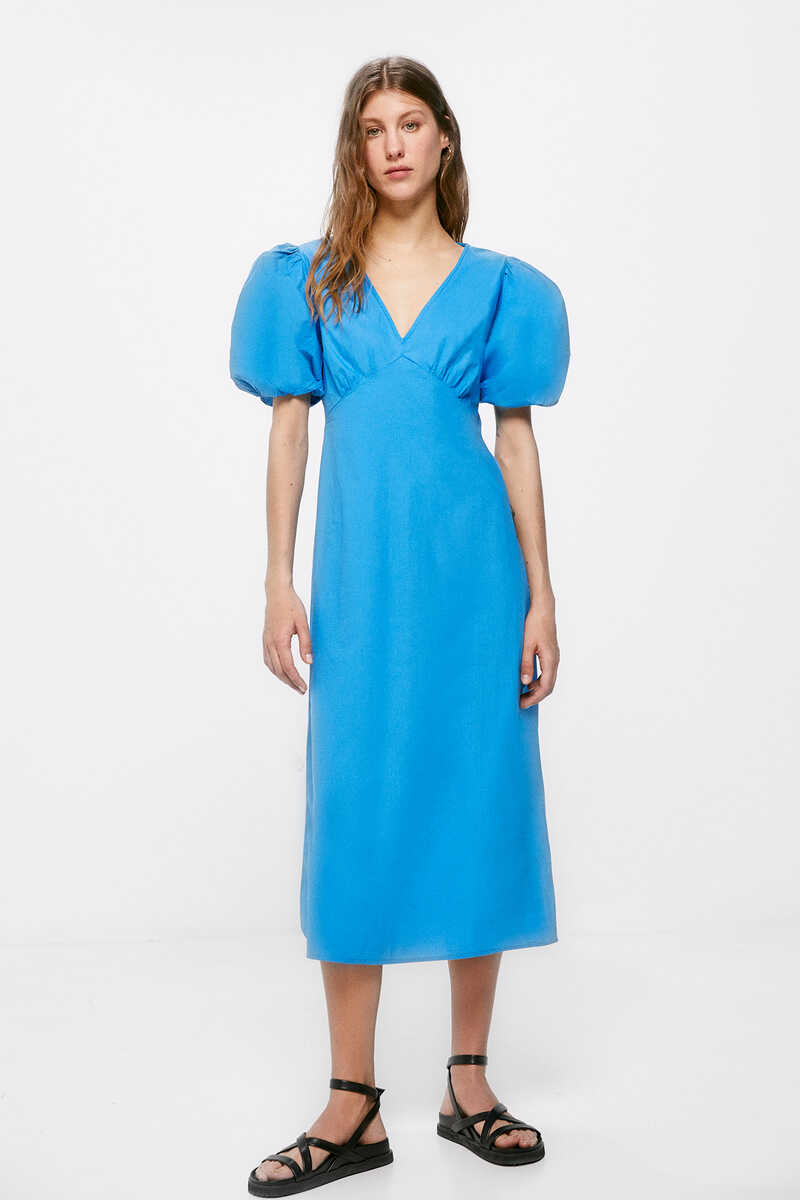 El corte midi es uno de los más favorecedores y así lo demuestran desde Springfield a través de prendas como este bonito vestido. Uno de los detalles por los que más destaca es gracias a su vibrante color azul. Sin embargo, también llama la atención por sus mangas abullonadas y por ser ajustado en el escote. Sobre su precio, ahora puedes conseguirlo por solo 29,99 euros cuando antes costaba 39,99.