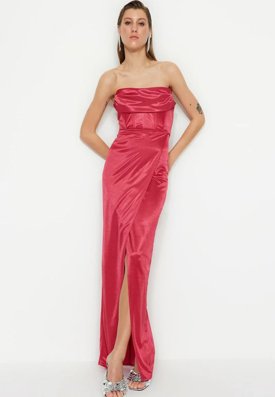 Este bonito vestido de terciopelo rosa es otra opción espectacular disponible en Zalando. Tiene un corte ajustado y una forma recta, lo que le brinda una apariencia elegante y sofisticada. Es un diseño muy largo, lo que aporta un toque de glamour y sofisticación. La falda presenta un efecto cruzado y una abertura en la pierna. El escote palabra de honor con hombros descubiertos resalta la zona del pecho y el cuello, y además, está ceñido en la cintura para resaltar la silueta. Además, cuenta con un acabado brillante que le añade un toque de estilo y glamour adicional. En Zalando, este encantador vestido está disponible con un descuento del 24%, por lo que su precio actual es de 52,99 euros.