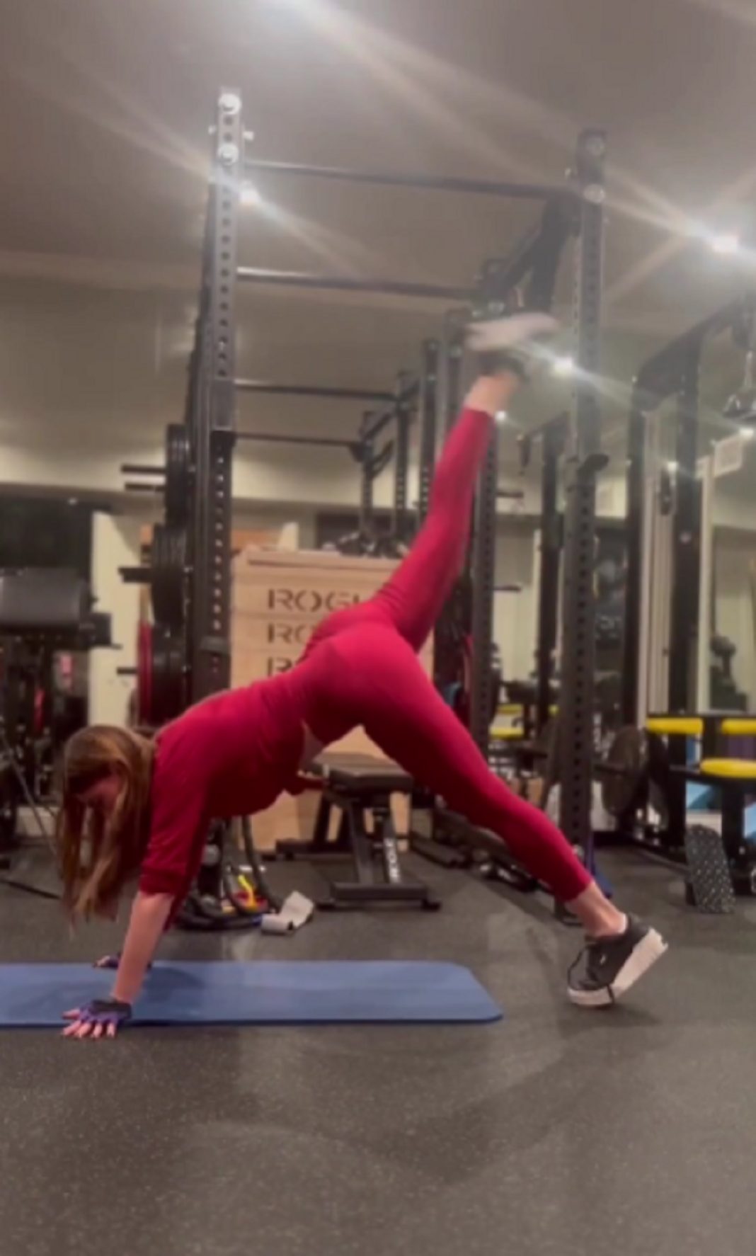 En el último ejercicio que la mediática compartió con su audiencia estaba con las caderas elevadas, colocando las manos en el suelo y los pies. Creaba con su cuerpo una especie de triángulo boca agua. Cuando consigue alcanzar el equilibrio, levanta y baja una de las piernas activando los músculos de la zona. Para que la intensidad de sus movimientos sea todavía mayor, añade bandas elásticas en su actividad física. Le ayuda a aumentar la exigencia y lograr resultados satisfactorios.