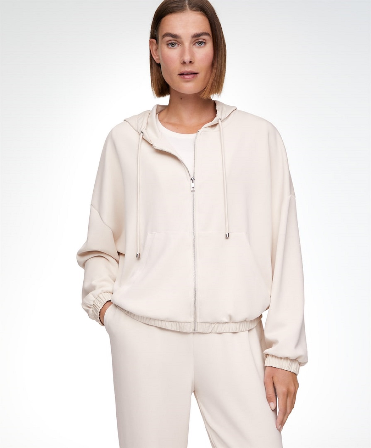 Cientos de clientas de Oysho ya han caído rendidas al conjunto de chaqueta y pantalón de la marca. Quedan espectaculares juntos y también por separado. Cuenta con los mismos beneficios que el pantalón, pero aplicados a la función que aporta una chaqueta: tejido de modal, calidad ‘soft touch’. Presenta una capucha ajustable mediante cordón y cierre frontal por cremallera. Tiene bolsillos laterales, cintura elástica y mangas acabadas en puño. Su precio es 35,99 euros.