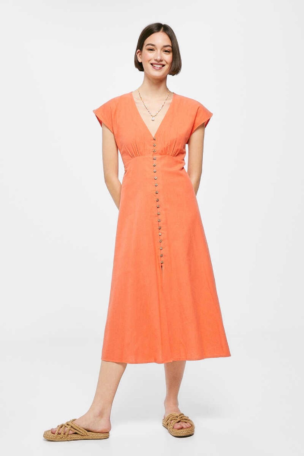 La finalidad de un bolso no es estar siempre despampanante y rompedora. Puede que simplemente queramos tener en el armario un vestido para utilizar a diario y estar fresquitas. Springfield tiene en su catálogo esta pieza adorada en la que lo único que brillará serás tú misma. Aporta luminosidad con su color naranja, pero no tiene demasiadas florituras ni zonas en las que se llame demasiado la atención. Es elegante y sobrio. Con él, nunca estarás mal vestida. Su precio es 39,99 euros.