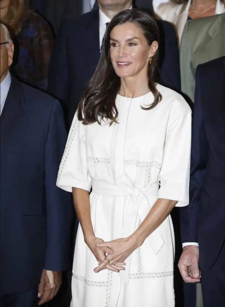 En esta ocasión, la reina Letizia ha vuelto a brillar gracias a su cuidado estilismo. La prenda principal del look es un vestido de color blanco y diseño capa, de Massimo Dutti, con el que la hemos podido ver en otro evento. En concreto, la reina estrenó esta prenda el pasado mes de septiembre en el acto inaugural del Año Picasso. Ahora, sin embargo, ha conseguido darle un toque diferente por completo gracias al buen uso de los complementos.