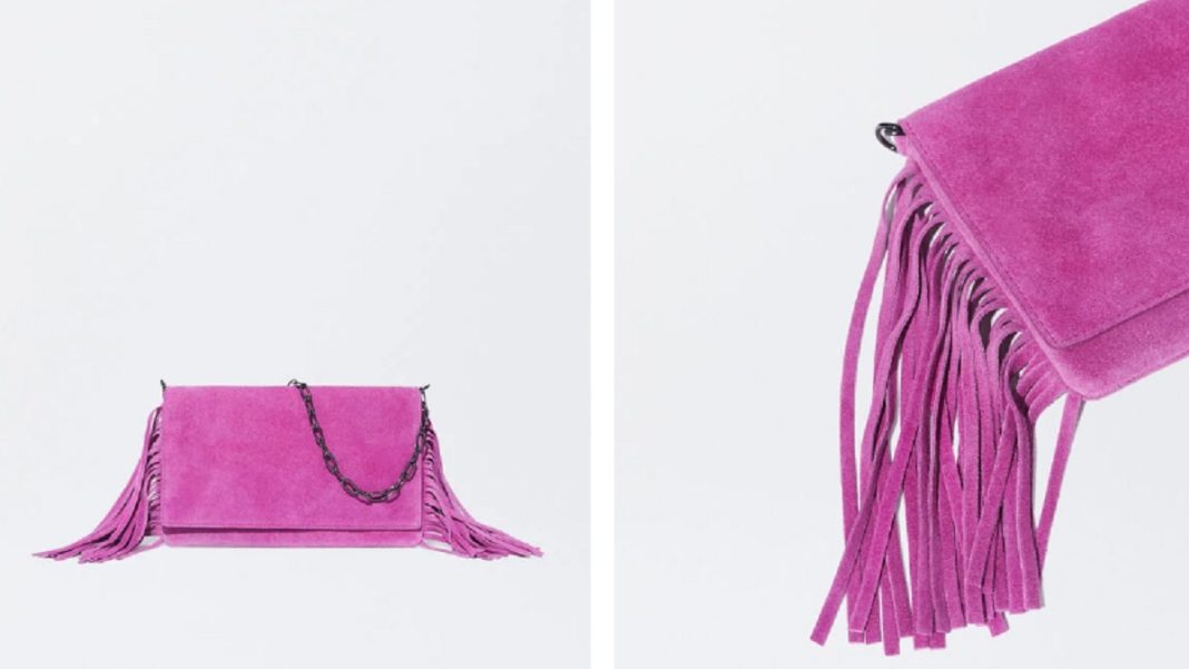 Este bolso de piel con flecos es sinónimo de originalidad. Mientras hay personas que consideran la piel como material únicamente para el invierno, existen expertos como los de la firma que reinventan este material para traer creaciones tan sublimes como estas. Esta preciosidad cuenta con cierre con solapa con imán y tachuelas decorativas. Posee además un detalle de flecos en los laterales, asa de hombro de cadena. Es una bandolera ajustable y extraíble con un bolsillo interior con cremallera. Vale 49,99 euros.