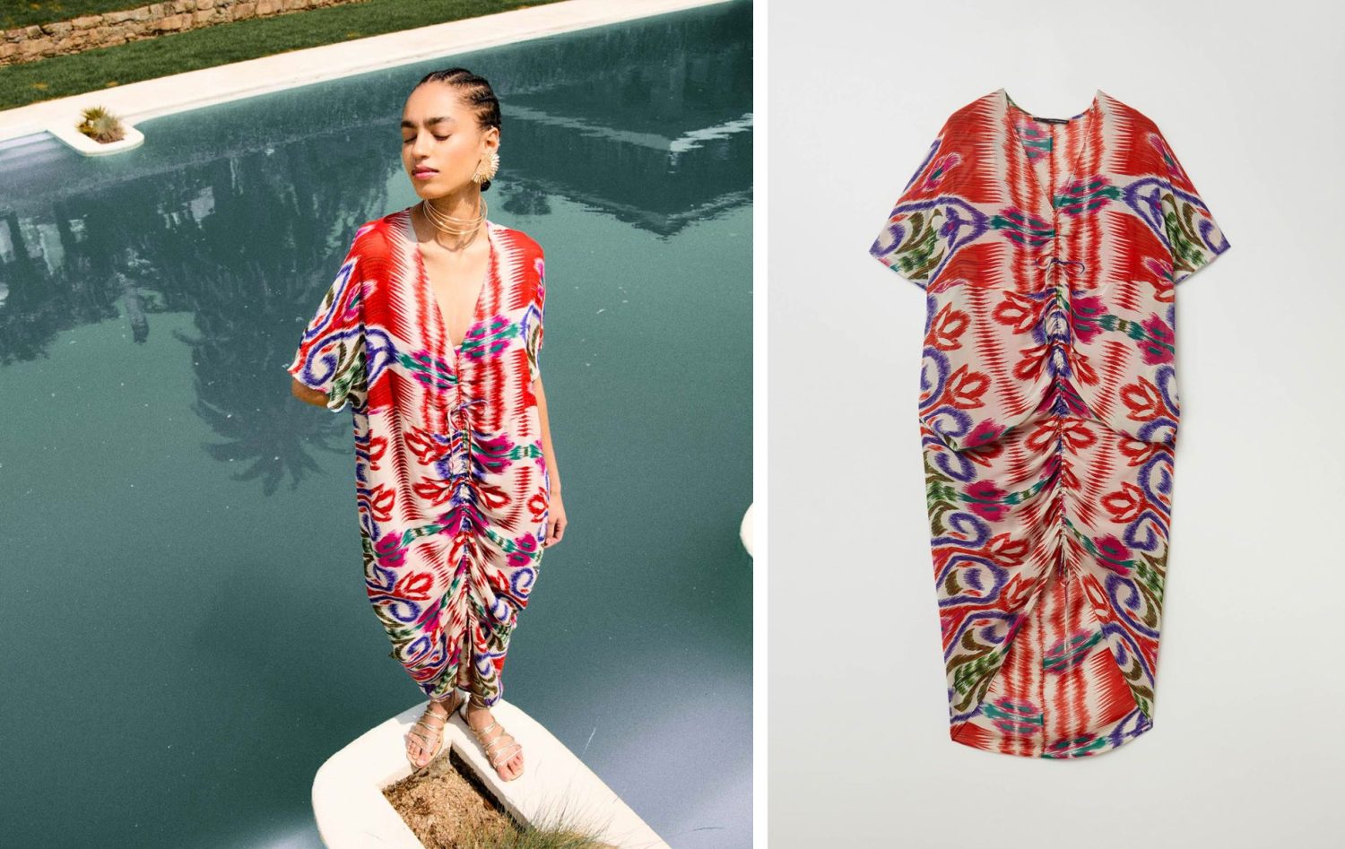 Si estás buscando un estilo veraniego con un toque étnico, no puedes perderte esta túnica midi de Sfera. Con un estampado étnico en tonos rojo, crudo y azul, esta prenda en tejido fluido te brindará un estilo fresco y exótico. Con un escote de pico que realza tu feminidad y mangas cortas y anchas para mayor comodidad, su corte relajado te permitirá disfrutar del verano sin restricciones. Además, su bajo asimétrico y el detalle de cordón frontal ajustable para fruncirlo le añaden un toque de originalidad. Por si fuera poco, podrás obtenerla por tan solo 49,99 euros en tallas S y M. No pierdas la oportunidad de lucir esta fabulosa túnica y deslumbra con estilo en esta temporada estival.