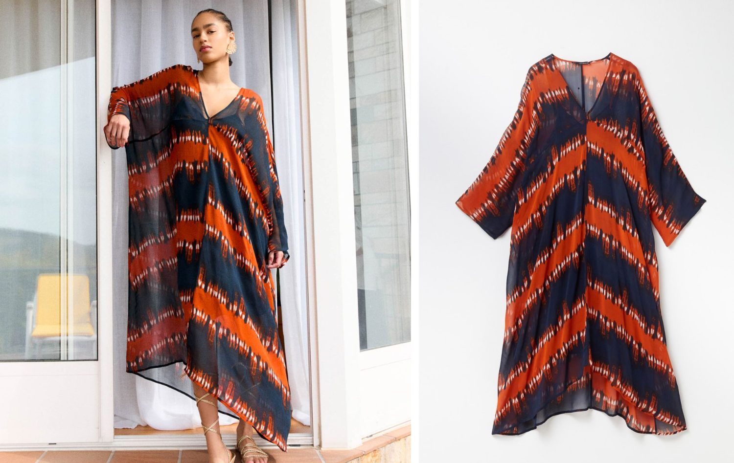 Para estar fresca y cómoda en tus vacaciones, no hay prenda más adecuada que esta túnica midi de Sfera. Confeccionada en un tejido fluido y ligero, te mantendrá fresca incluso en los días más calurosos. Su diseño con estampado tie-dye en tonos azul y teja te brinda un estilo bohemio y relajado, perfecto para disfrutar del verano. Las mangas largas y anchas tipo murciélago te ofrecen libertad de movimiento, mientras que el corte amplio asegura comodidad en cada paso. El escote de pico y el bajo asimétrico añaden un toque de originalidad y estilo. Prepárate para disfrutar tus vacaciones con esta túnica, una opción imprescindible para sentirte fresca y cómoda en todo momento.