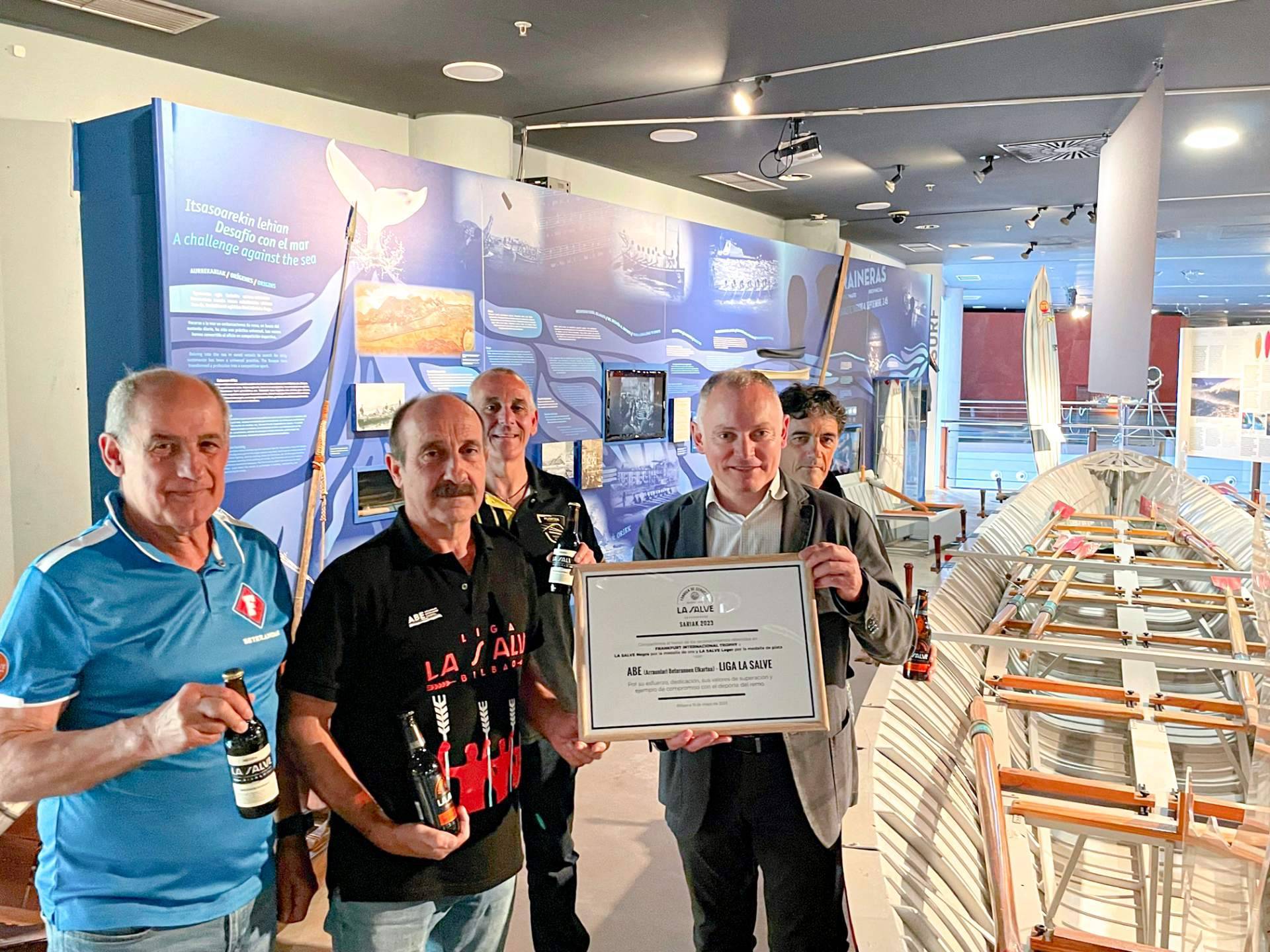 LA SALVE es la cerveza de Bilbao y de su gente. Los éxitos de esta cerveza multipremiada son colectivos y, en esta ocasión, hace entrega de las medallas obtenidas en el festival de cerveza de Frankfurt a la asociación de remeros ABE (Arraunlari Beteranoen Elkartea), Liga de remo LA SALVE, por su esfuerzo, dedicación, por su promoción del deporte del remo y por compartir valores comunes. La entrega tuvo lugar en el Itsas Museum bilbaino y al mismo acudieron representantes de ABE y el director de cervezas La Salve, Eduardo Saiz Lekue.
