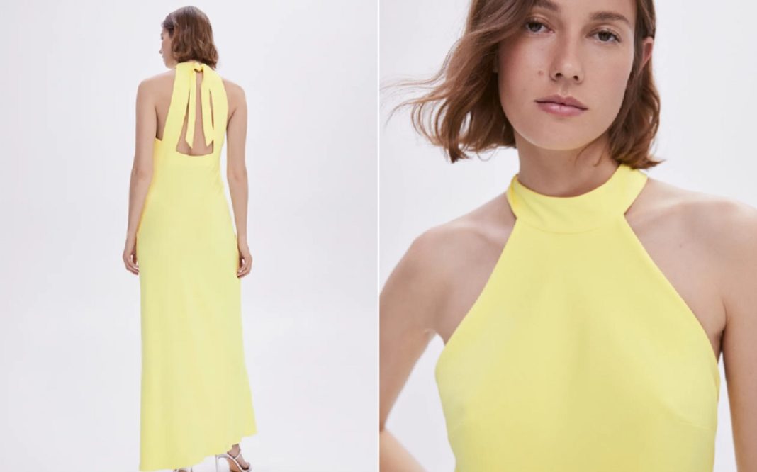 Esta pieza es bastante parecida a la anterior, pero con una tonalidad que no se ve mucho por ahí. El amarillo pastel nos recuerda a la vainilla y a los aromas dulces que suelen llevar las damas oportunidad y con comportamientos apropiados. Si tu misión en tu próxima reunión es dar el mensaje de elegancia y seriedad, este modelo tiene que ser para ti. Posee un tejido fluido súper cómodo, un diseño recto, largo, entallado con cuello halter y sin mangas. Cuenta con un cierre trasero y lateral de cremallera. Confía en este modelo de fiesta y ceremonia que te llevará a las nubes sin billete de vuelta. Vale 69,99 euros.