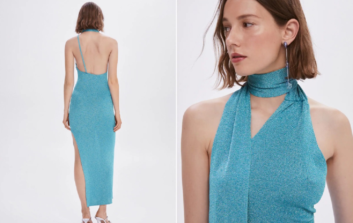 La firma está apostando fuerte por los colores lisos este año sin demasiado estampado. Este azul tiene algo de brillante que lo transforma inmediatamente en una apuesta arriesgada para las fiestas más finas a las que acudas. Un diseño entallado con cuello asimétrico y en forma de choker que nos permitirá ir recatadas, pero perfectas para un evento de día. Todas las invitadas se acercarán a ti para saber dónde te lo has comprado. Nadie te creerá cuando les digas que solo te has gastado 59,99 euros.