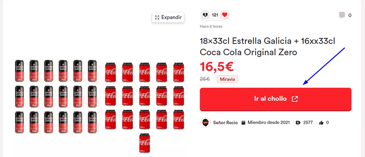 Este chollo solo lo podrás conseguir si sigues los siguientes pasos. Pulsa sobre OFERTA COCA COLA + CERVEZA e irás a la página de Michollo. Una vez allí pulsa sobre Ir al chollo para acceder a la página de la oferta.