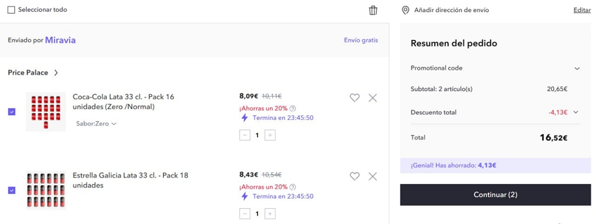 Añade 1 pack de Coca Colas a tu cesta de compra y repite la operación añadiendo un pack de cervezas Estrella Galicia. Ambos productos los puedes encontrar en la tienda Price Palace.