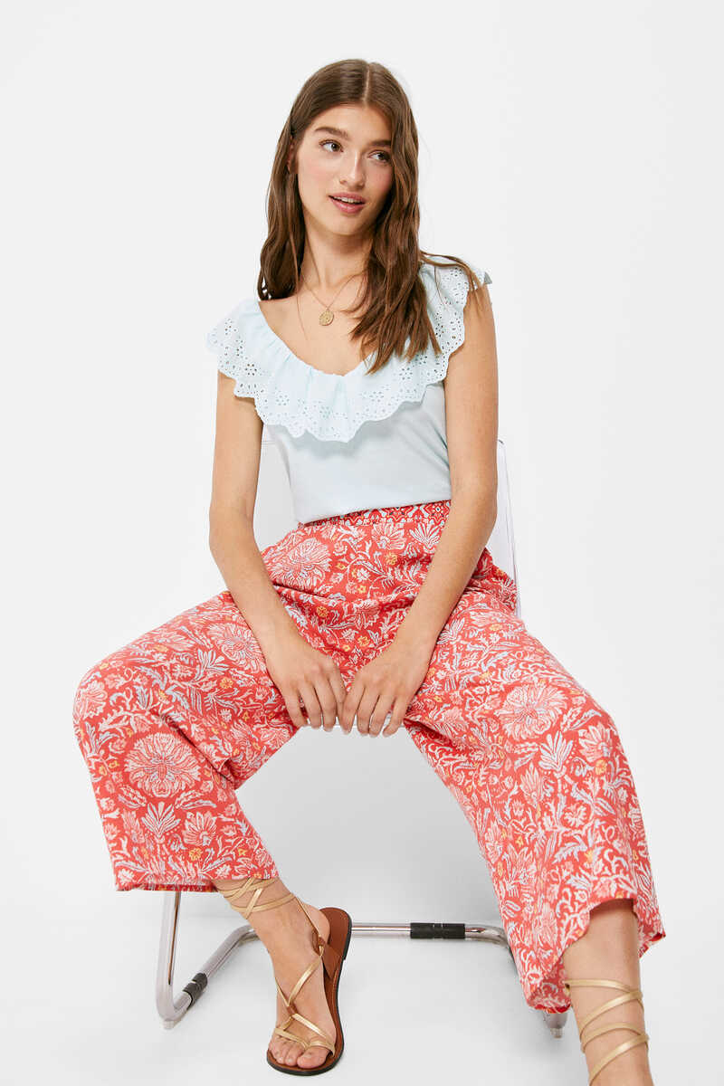 Los pantalones anchos y cómodos también son opciones perfectas para el verano. En este caso, una de las opciones que más llaman la atención en Springfield es este pantalón de diseño culotte que destaca gracias a su atractivo estampado. Disponible en un bonito tono rojo coral, con estampado en blanco, será la prenda perfecta para completar cualquiera de tus looks este verano. Además, te puedes hacer con él por tan solo 29,99 euros.
