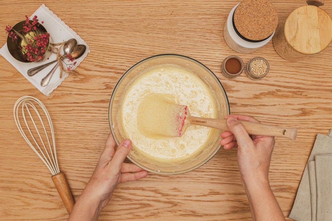 Mientras seguimos batiendo sin parar y poco a poco, agregamos el azúcar. Cuando están batidos los huevos y el azúcar, incorporamos la harina, también poco a poco y sin dejar de batir. El batido debe hacerse con energía para alcanzar nuestro objetivo: una mezcla homogénea. Engrasamos un molde cuadrado o rectangular (de cristal o aluminio) con aceite y harina y mezclamos. Una vez listo, ponemos la masa en el molde previamente engrasado y metemos en el horno por 40 minutos a 180 grados.