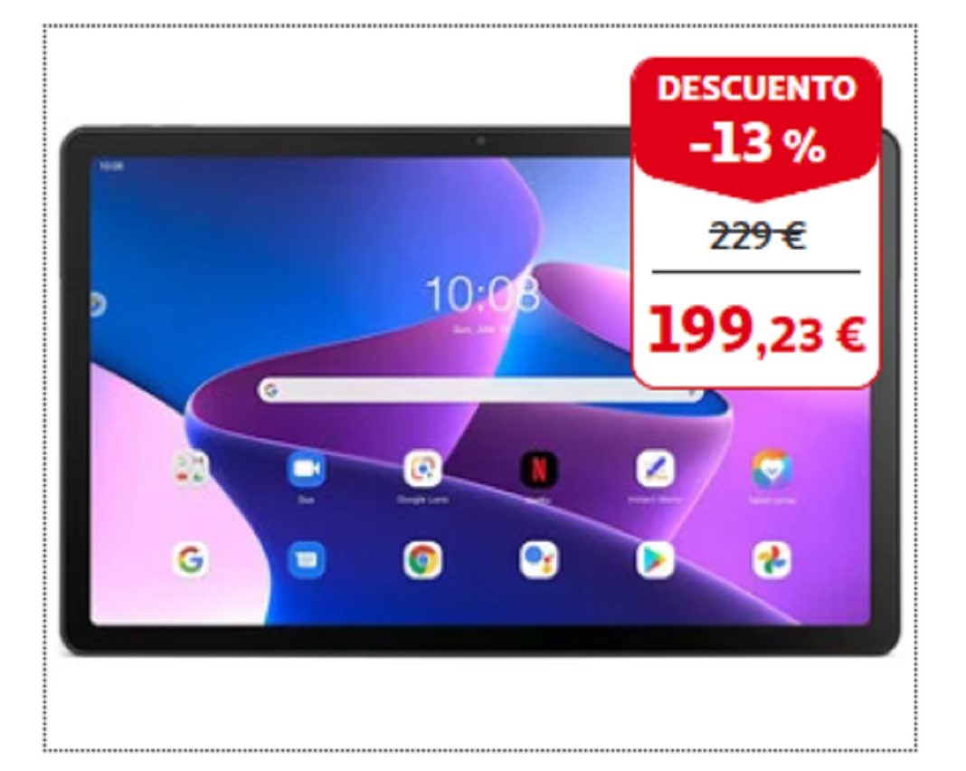 Alcampo nos transporta a otro mundo con su deslumbrante pantalla IPS 2K de 26,92 (10,6’’) de la Tab M10 Plus de Tercera Generación. Podrás gozar de las series más chulas con el uso de Netflix, Disney+ y otros servicios hasta en 108p, la máxima resolución que existe para este tipo de dispositivos móviles. Cuenta con la certificación TÜV Low Blue Light, gracias a la que podrás estar largas horas frente a la pantalla de forma cómoda. Asimismo, tiene 4 altavoces, gracias a los que sentirás que el sonido que sale del aparato te envuelve. Prácticamente es una TV smart en miniatura. Su precio es 199,23 euros.