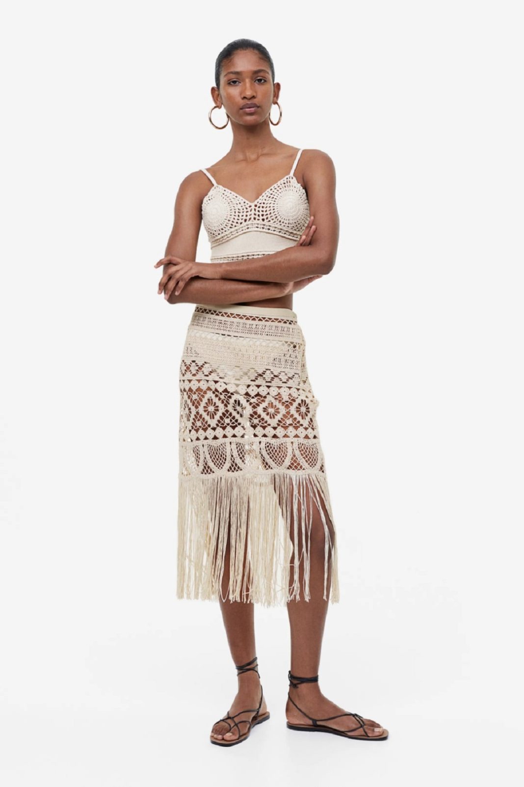 H&M nos trae una falda efecto crochet que nos saca de nuestros esquemas. Pese a que el crochet se suele asociar con épocas invernales, la firma reconfigura esa idea. Esta falda midi ajustada está causando sensación tanto para irse de cenita como para acudir estilosa a la playa. Además de ser súper bonita es cómoda 100%. Cuenta con cintura elástica, cremallera lateral oculta y flecos largos en el bajo. No está forrado y eso es lo que nos está llevando por el camino de la amargura. Si tu cumpleaños es este verano, ¡ya sabes lo que pedir! Su precio es 39,99 euros.