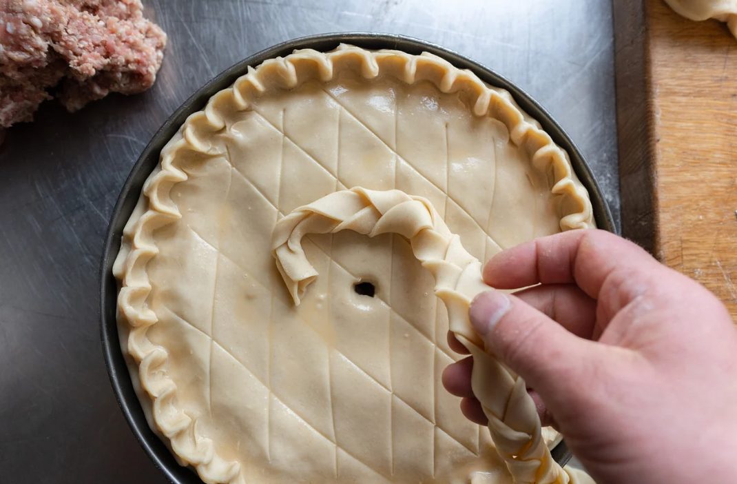 Lo siguiente que debes hacer es coger un molde desmontable de unos 22 cm de diámetro, apto para horno, y cubrir su base y paredes con la masa. Recorta lo que sobre y remata el borde con los dedos con algún adorno para que la tarta de frutas sea aún más resistible. Después, cubre con papel de horno y rellena con bolas para hornear. Cuece en el horno precalentado a 180 gradoos durante 15 minutos. Cuando pase el tiempo, retira el peso y el papel. Cuece otros 15 minutos antes de sacar y dejar enfriar.