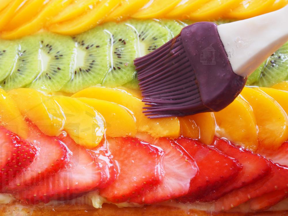Ahora, hidrata la gelatina en un cuenco junto a 3 o 4 cucharadas de agua durante 5 minutos. Coloca el resto del agua en un cazo y caliente. Cuando veas que alcanza el punto de ebullición, apaga e incorpora la gelatina hidratada. Remueve bien hasta que se disuelva y deja que se atempere. Según se enfría, el baño de brillo para tu tarta de frutas se espesará. Por ello, debes estar pendiente y remover de vez en cuando. Cuando logre la consistencia de mermelada, estará listo.