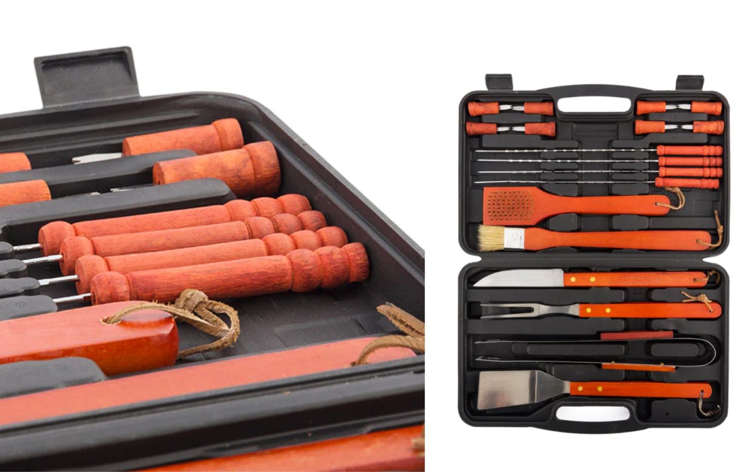 6Un maletín completo para barbacoas: utensilios de acero inoxidable con mango de madera