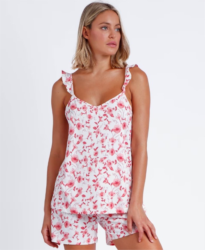 Si buscas un toque femenino y coqueto en tu ropa de dormir, el pijama de mujer de tirantes con detalle de volantes es ideal para ti. Confeccionado en suave punto de algodón, este conjunto presenta tirantes finos decorados con encantadores volantes.