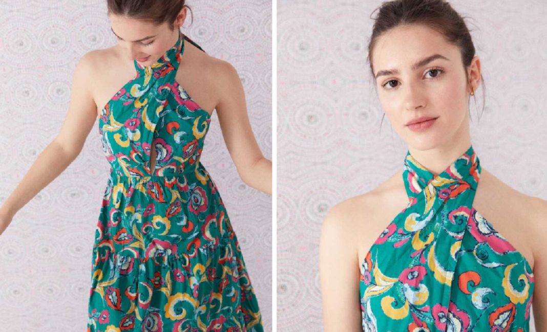 Springfield ha triunfado con este vestido de tirantes con escote halter, espalda desnuda, abertura en el escote, falda panel con volante en el dobladillo y estampado. Con solo verlo nos damos cuenta de que es una apuesta fresca y dinámica para vivir el verano a tope. El sol invita a la actividad y la diversión, dos conceptos que están grabados a fuego en esta prenda. Gozarás de plena libertad de movimiento, irás preciosa y lucirás tu morenito. ¿Qué más podríamos pedir? Ah, sí, que sea barato. Su precio es 29,99 euros, con un 25% de descuento. Aprovecha ahora antes de que te lo quiten de las manos.