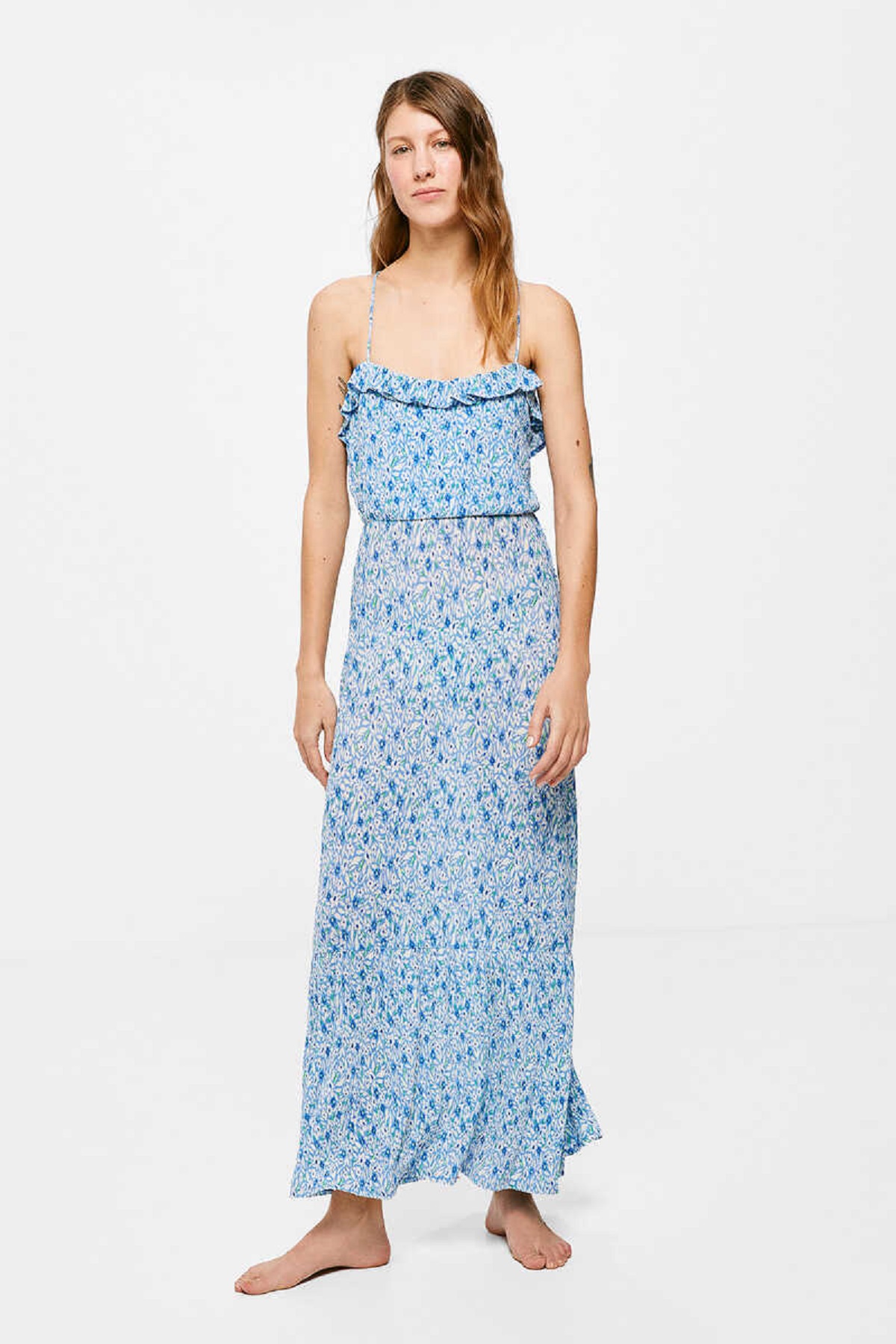 El azul es uno de los colores que más está sorprendiendo este año. La combinación con el blanco siempre logra inspirar. De hecho, no en vano uno de los destinos más buscados este verano es Miconos, la isla griega donde todas las casas tienen estos colores. No es la única razón, pero es una de las tantas por las que se elige. Esta pieza cuenta con una espalda abierta con tirantes cruzados y lazo, elástico en la cintura, un volante en el dobladillo y un estampado de flores azul. Con mil suspiros nos quedaríamos cortas. Vale 24,99 euros.