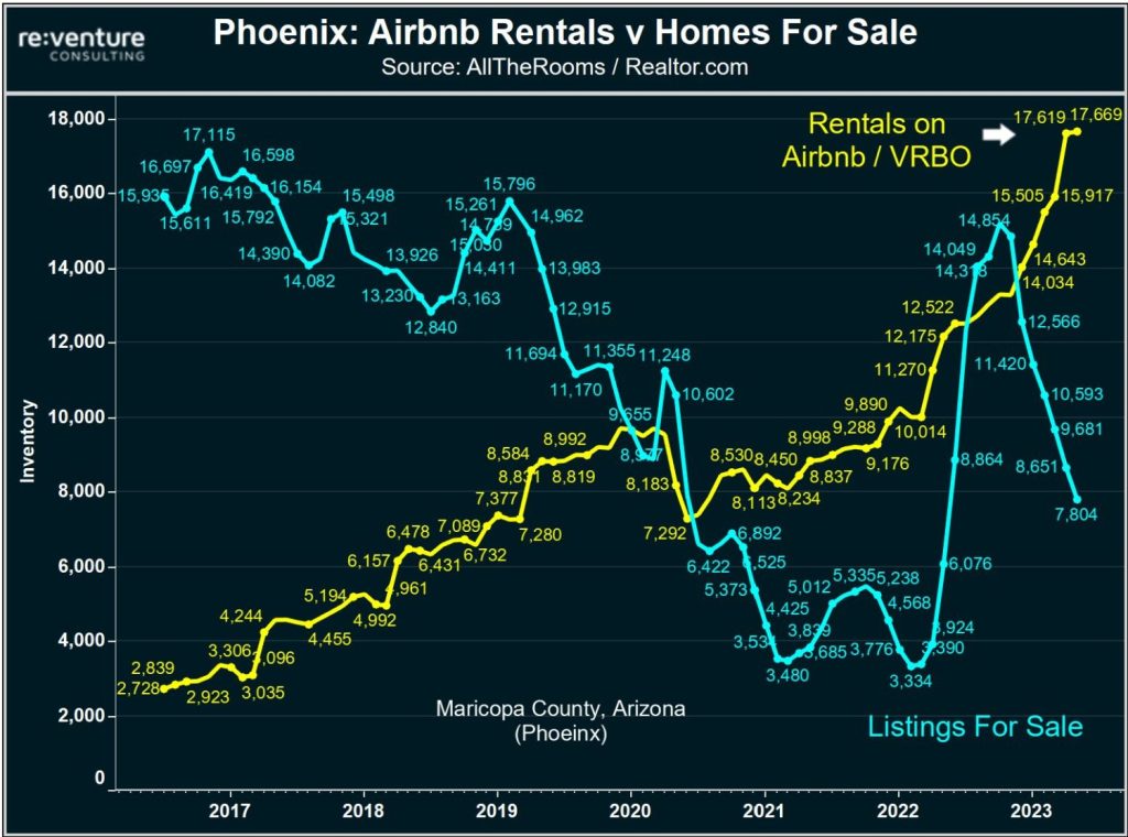En este sentido, Airbnb ha pasado de ser un refugio en la pandemia a convertirse en una pesadilla para el mercado inmobiliario. Las viviendas inscritas en la plataforma duplican a la oferta de alquiler. Ā«Si los propietarios de los pisos de Airbnb deciden vender, serĆa el fin de la plataformaĀ», advierten las fuentes consultadas. Este hecho ha provocado en gran parte la caĆda del precio de la vivienda. El colapso en Phoenix, considerada la Ā«zona ceroĀ» para Airbnb, el nĆŗmero de alquileres a corto plazo es mĆ”s del doble que el de anuncios de alquiler a largo plazo.