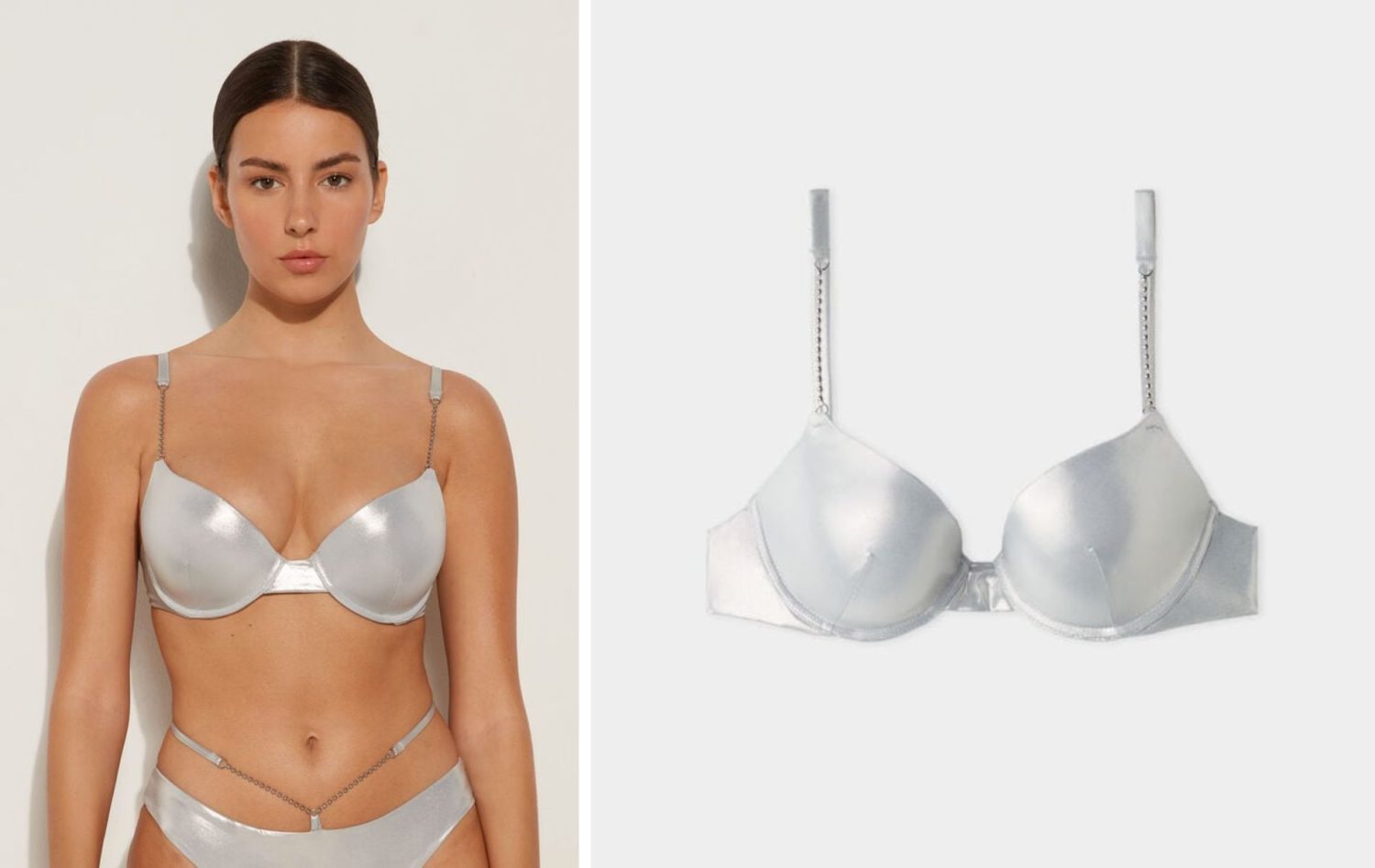 Su color plateado metalizado refleja los rayos del sol de una manera única, creando un efecto resplandeciente que no pasa desapercibido. Además, su forma triangular y las copas extraíbles proporcionan comodidad y versatilidad, permitiendo ajustar el nivel de soporte y realce según las preferencias personales. Ya sea para disfrutar de un día de relax en la playa o para lucir un look espectacular en una fiesta en la piscina ‘una opción que no defrauda’.