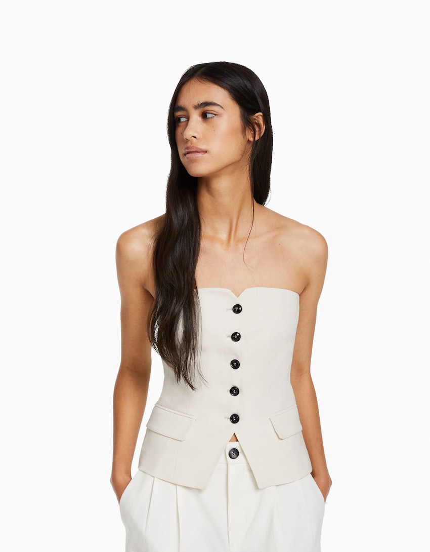 Esta es otra de esas prendas que no hemos dejado de ver en los looks de los últimos meses. Si siempre te has querido hacer con un chaleco tailoring que haga las funciones de top, ahora tienes una gran oportunidad. Este, de color blanco y con botones oscuros, será ideal para construir looks poderosos donde la formalidad deba estar presente. Sobre su precio, te puedes hacer con él por solo 12,99 euros en lugar de 25,99. Sin duda, será tu mejor inversión.