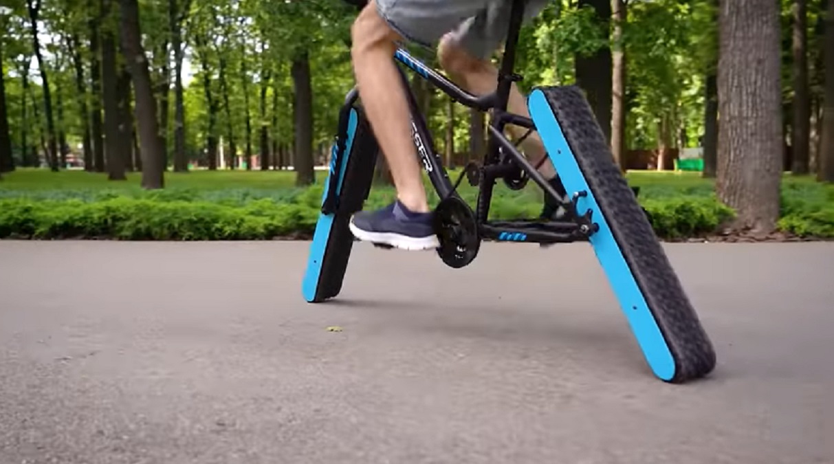 No presenta ruedas como las conocemos, pero sí dos ruedas de oruga con una cinta a su alrededor, como si estuviéramos ante un tanque. Así se logra un buen agarre a la superficie. No es la solución más práctica del mundo, pero funciona. No puede competir con las bicis eléctricas más rápidas del mercado, pero puede ser un invento revolucionario. Al tener una reducida superficie de contacto con el suelo y tener unas ruedas de oruga presenta problemas para girar.