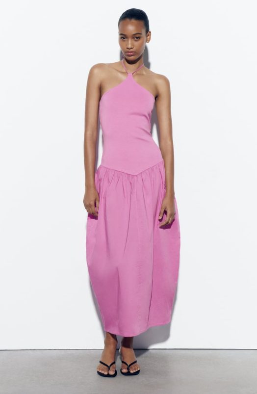 Con el estreno de la película de Barbie cada vez más cerca, no cabe duda de que uno de los tonos que más se han puesto de moda es el rosa. Así lo demuestran desde Zara con este vestido de cuello halter combinado que resulta muy romántico y femenino. Además, ahora te puedes hacer con él por tan solo 9,99 euros en lugar de 22,95. Te lo pondrás con todo.