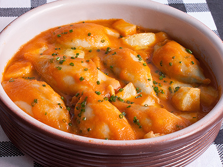 En la misma sartén, sofreímos el ajo y la cebolla para que se impregnen de los aromas y sabores del calamar. Una vez que esté pochada la cebolla agregamos el brandy y mantenemos al fuego hasta que el alcohol se evapore. Rallamos los tomates y los agregamos al guiso. Sofreímos todo junto durante unos minutos y añadimos un toque de cúrcuma que aportará color y sabor.