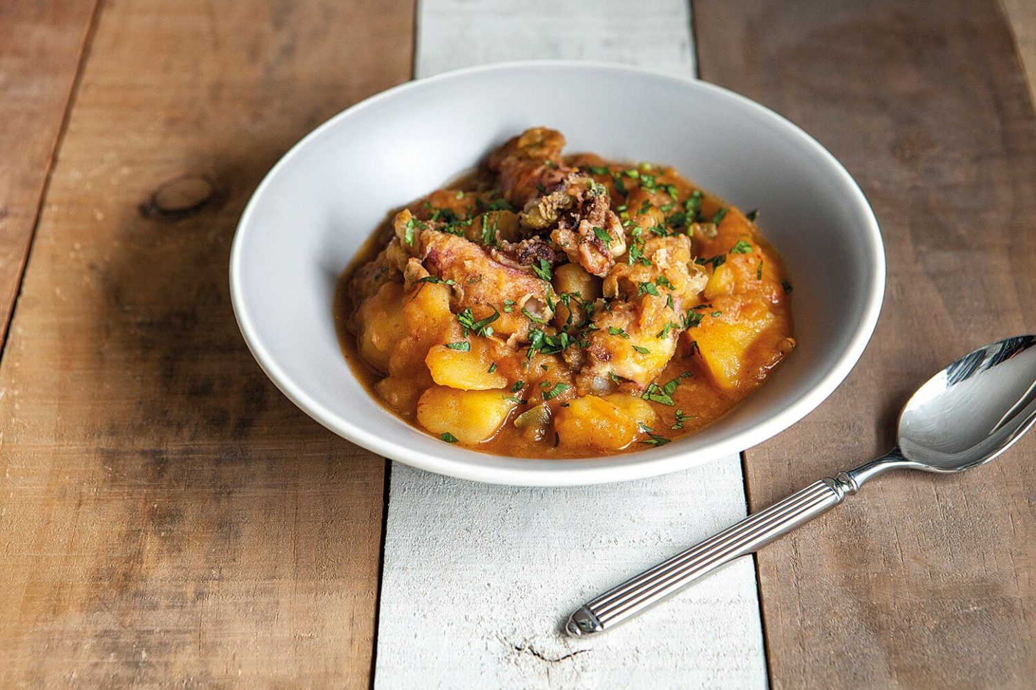 Por otro lado, cortamos y chascamos las patatas. Esta forma de corte ayuda a que se desprenda el almidón para que la salsa quede con más cuerpo. Sofreímos las patatas con las verduras dándoles unas vueltas para que se impregnen bien de los sabores y a continuación añadimos el fumet previamente calentado. Colocamos con cuidado los chipirones rellenos y dejamos que cocine todo junto durante 10-15 minutos, los primeros minutos con la tapa puesta y luego sin ella. Opcional pero muy recomendable para realzar el plato, rallar piña de pino sobre el plato.