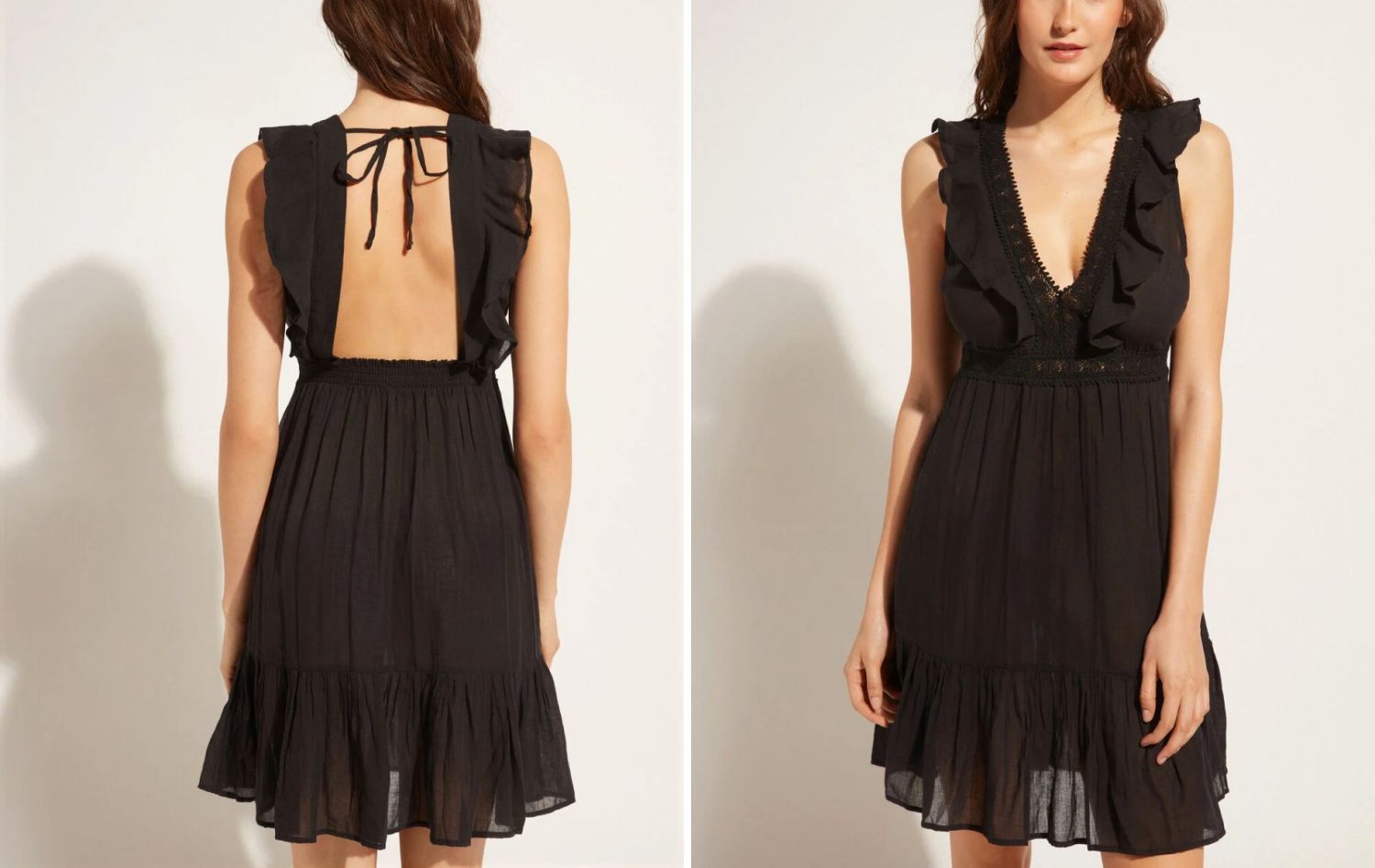 El vestido corto con volante y pasamanería en color negro es una opción perfecta para lucir elegante y con estilo. Confeccionado en algodón 100%, este vestido presenta un diseño encantador. El volante y la pasamanería adornan el escote y se extienden debajo del pecho, añadiendo sofisticación y originalidad. El cierre posterior con cordón fino realza el profundo escote en la espalda, creando un detalle llamativo y seductor.