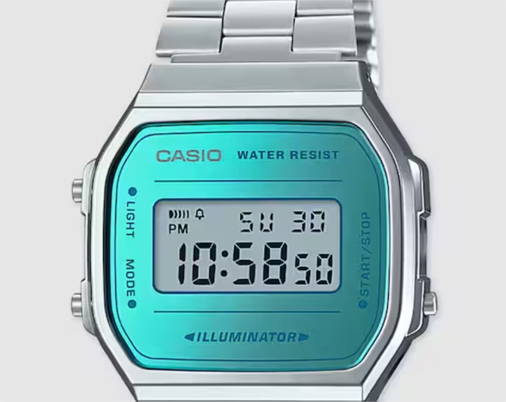 Innova tu estilo con el Reloj de la Colección Casio A168WEM-2EF Mirror Face, un reloj digital resistente y sofisticado. Con una caja de resina y una esfera turquesa, este reloj ofrece un contraste fresco y moderno con su elegante brazalete de acero inoxidable.