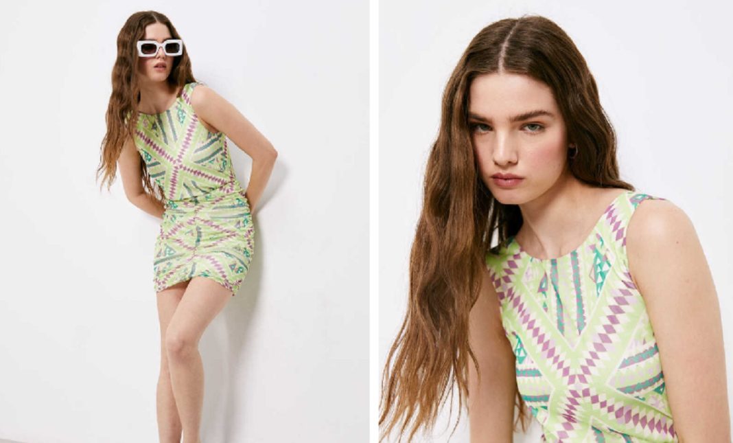 Este vestido de Springfield genera un flechazo desde el primer momento. Sus formas geométricas, colores y largo hacen que nuestra mente se traslade a otra dimensión. Es la mezcla perfecta entre un vestido bonito para la ofi y a la vez desenfadado. Posee un cuello redondo y no tiene mandas, lo que lo convierte en un diseño súper fresquito para esta época de “buen tiempo”. Si nos apuras, hasta puede ser el vestido que necesitas para los eventos de día a los que te invitarán lo que queda de verano. Su precio es 15,99 euros.