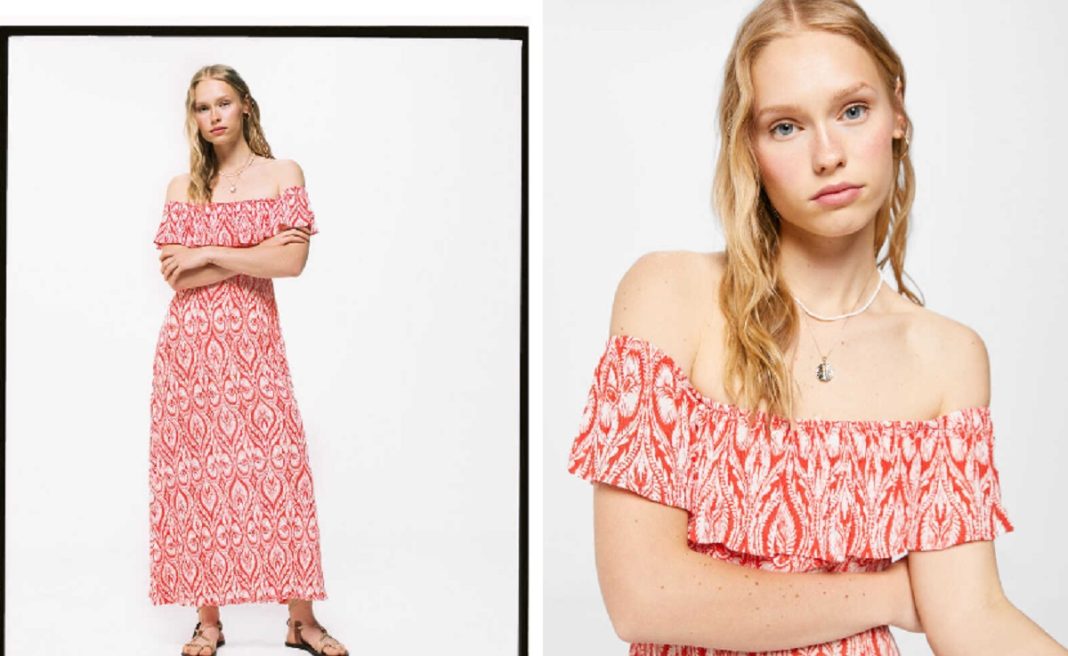 Nuevamente estamos frente a una pieza midi, aunque esta vez con un diseño muy diferente al anterior. Predominan los colores rojo y blanco, aunque lo que realmente nos mata de este vestido es que tienen los hombres descubiertos. Un remate súper veraniego que también nos permite mostrar el morenazo que hemos adquirido después de horas frente al sol. Su precio es 35,99 euros.