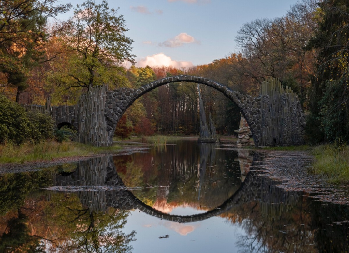Uno de los lugares más curiosos para visitar este verano es Alemania. Se encuentra en medio de un escondido parque floral, en el partque Kromlauer, en Kromlau, donde se halla el Puente del Diablo. Este nombre lo recibió por su arquitectura. Fue construido de tal manera que, independientemente desde donde lo mires, puede aprecisarse cómo se crea un círculo perfecto entre su propia forma y el reflejo del agua.