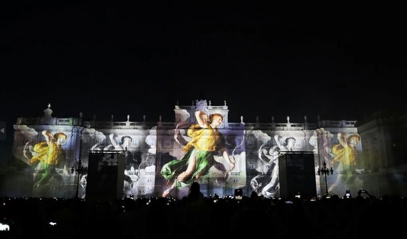 Alrededor de 18.000 personas disfrutaron este miércoles por la noche del ‘videomapping’ de la Galería de las Colecciones Reales, un audiovisual de luces, colores y efectos visuales proyectado sobre la fachada principal del Palacio Real de Madrid, según informa Patrimonio Nacional.