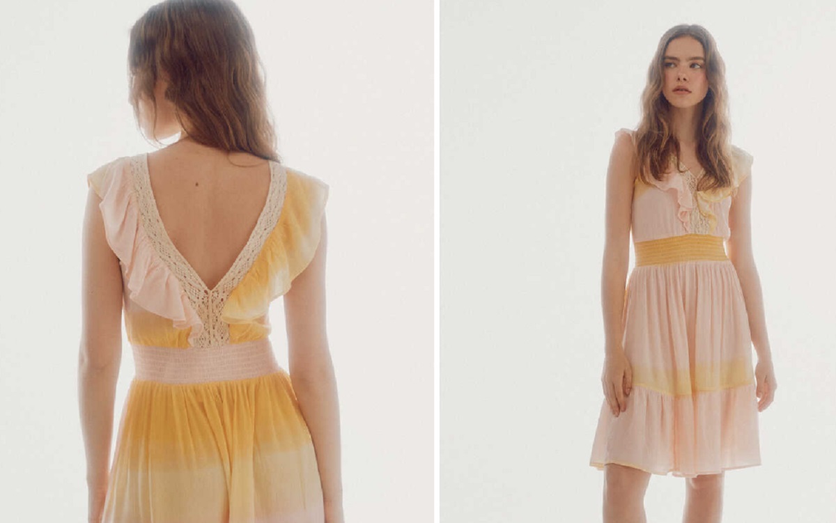 Los suspiros aparecen cada vez que una clienta de Cortefiel aparece en público con este vestido. ¡Y no es para menos! Da la sensación de chica ‘sweet’ de principio a fin. Está hecho en tejido sostenible, un plus que lo hace todavía más atrayente. Cuenta con un escote pico sin mangas que nos lleva al cielo. El detalle combinado entre emparejamiento y volantes es la bomba. Si te descuidas puede que vayas a la web o a tu tienda más cerca y no queden ejemplares. Su precio es 24,99 euros.