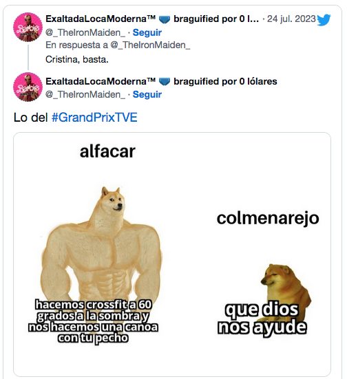 El pueblo de Alfacar ha sido el claro ganador en la primera ronda del esperado regreso del Grand Prix del Verano. Todo un hito. Como era de esperar, el popular meme del perro grande y el perro pequeño ha hecho su aparición en Twitter, para celebrar el triunfo con humor y diversión.
