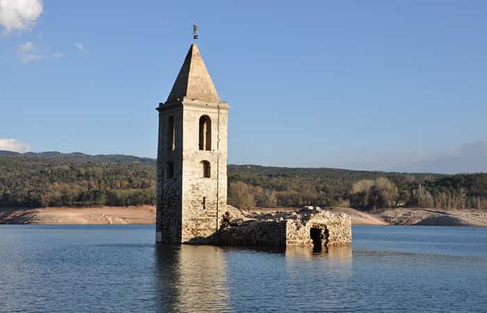 La inundación del embalse de Sau engulló por completo el pueblo de Sant Romà, dejando bajo el agua todos sus edificios, incluido el campanario de su iglesia. Cuando el nivel de las aguas baja, es posible ver este campanario, que se considera el más antiguo del mundo que se mantiene en pie dentro del agua, lo que lo convierte en un espectáculo singular y fotogénico.
