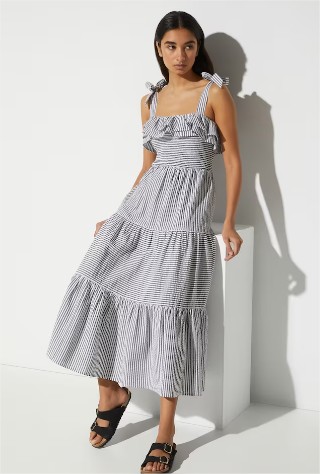 Elegancia y frescura se funden en este vestido midi en un impecable color blanco. Su doble volante no solo le da un toque dinámico, sino que realza la figura con su delicado caída. Perfecto para esos días de verano o para un evento especial.