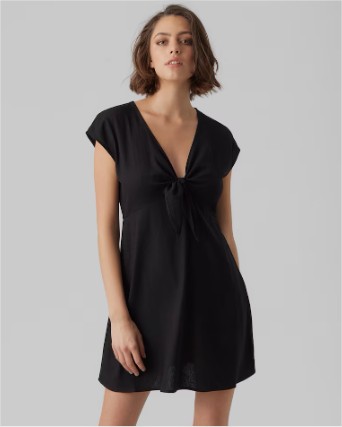 El encanto del hombro caído vuelve a ser tendencia este verano. Este vestido, en un elegante color negro, combina a la perfección lo casual con lo sofisticado. Su diseño permite lucir los hombros con sutileza y, al mismo tiempo, se ajusta de forma ideal al cuerpo, ofreciendo una silueta atractiva y cómoda.