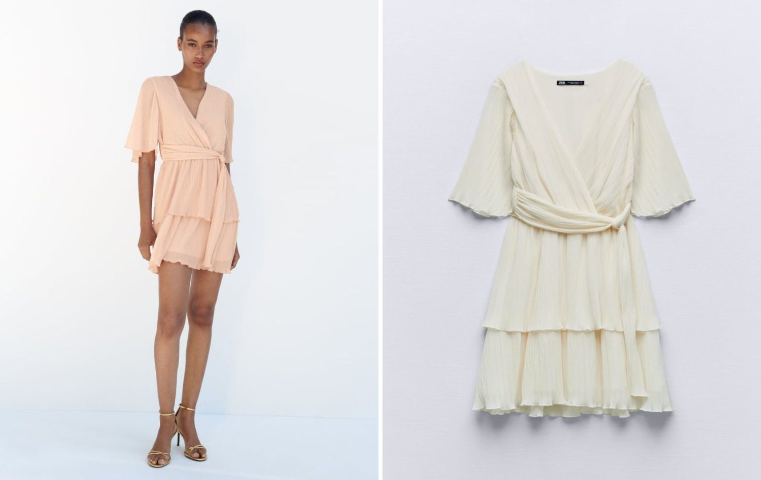 Sumérgete en la moda con un toque de frescura y elegancia gracias al «Vestido Mini Plisado» de Zara. Disponible en encantadores tonos de rosa claro y blanco roto, este vestido combina estilo y confort con un atractivo descuento del 49%, por solo 17,99 €. El diseño presenta un escote pico cruzado y mangas cortas, equilibrando hábilmente sensualidad y sofisticación. Una cintura elástica con nudo ajustable añade un toque lúdico y permite adaptar el ajuste a tu gusto.