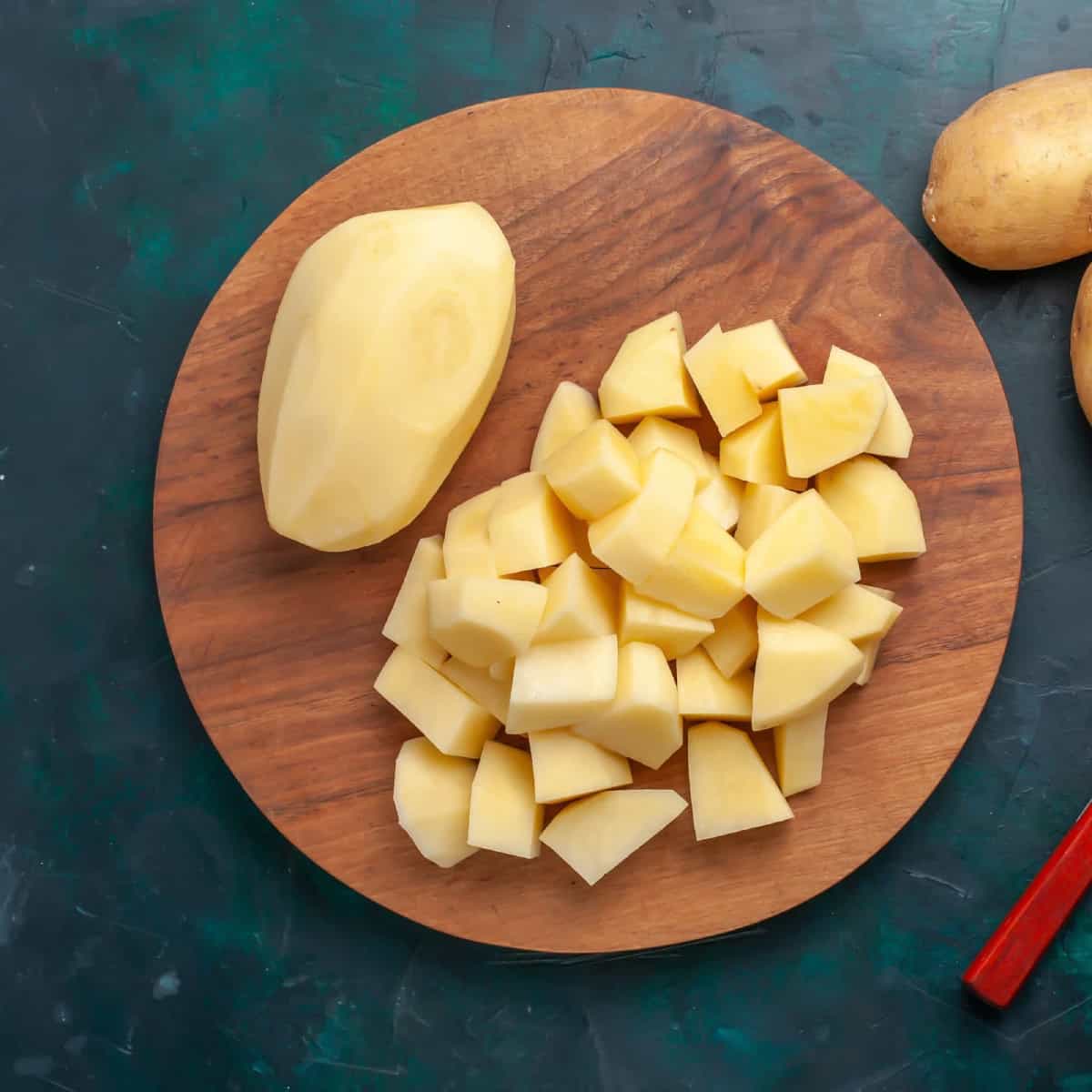Tras haber montado la mayonesa, es el momento de continuar preparando el resto de los ingredientes de esta ensalada de Berasategui. Para ello, pela las patatas que has cocido en el primer paso para después cortarlas en tacos o en rodajas, como más te guste. Cuando lo hagas, el siguiente paso consiste en picar también el jamón cocido o partirlo en pequeños tacos antes de montar la ensalada. Ahora, mezcla en un bol todos los ingredientes como te mostramos a continuación.