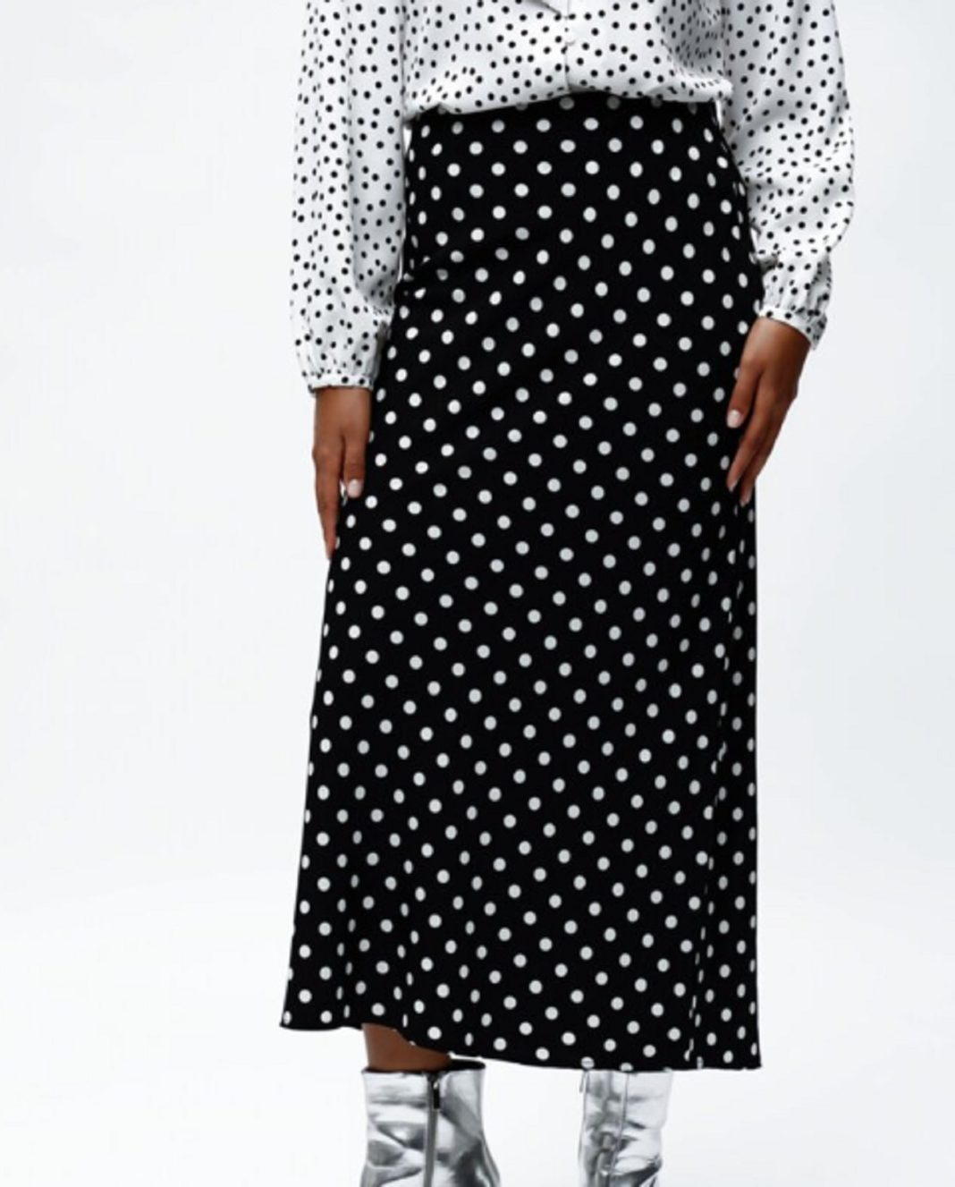 Lefties logra impactar con este diseño. Las más osadas optan por llevar la oficina y asegurarse de que son miradas. Se ve a kilómetros. Es tan llamativo como elegante. Esta preciosa falda midi de topos cuenta con un cierre de cremallera invisible en el lateral de la prenda. Su tejido fluido es súper cómodo. Combina muy bien con básicos, aunque ahora se puede mezclar con otros estampados sin que quede mal. ¡Atrévete a innovar! Su precio es 14,99 euros.