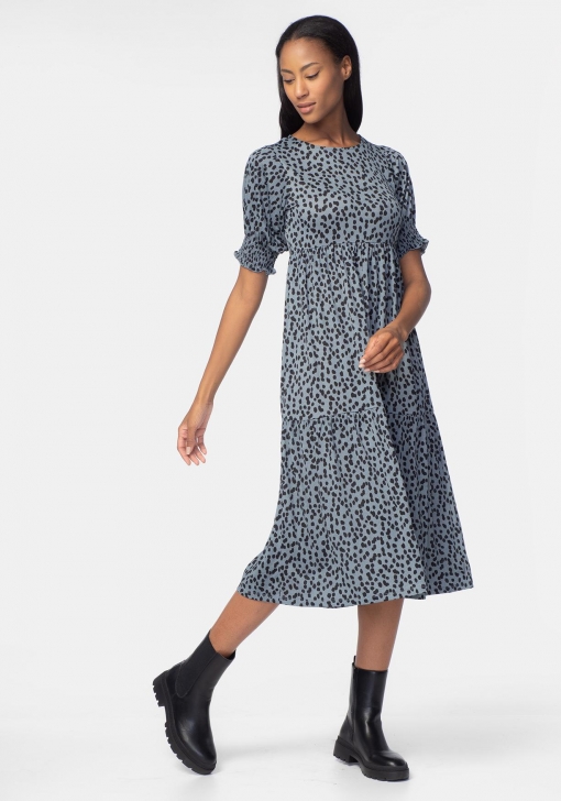 Si buscas comodidad sin sacrificar estilo este vestido de Carrefour es perfecto para ti. Se trata de un vestido de corte midi, suelto y con un bonito vuelo. El cuello es redondo y cuenta con unas bonitas mangas cortas con un fruncido decorativo que le da un toque romántico a la prenda. Está fabricado en poliéster y un 1% de elastano con un tejido estampado con un discreto animal print en verde musgo y negro. Es uno de esos vestidos que se pueden lucir en verano y hasta bien entrado el otoño. Lo tienes a 15,99 euros.